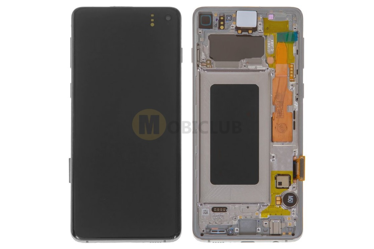 Дисплей Samsung G970F Galaxy S10e тачскрин сенсор черный в рамке серебристого цвета Prism White Amoled оригинал переклеено стекло